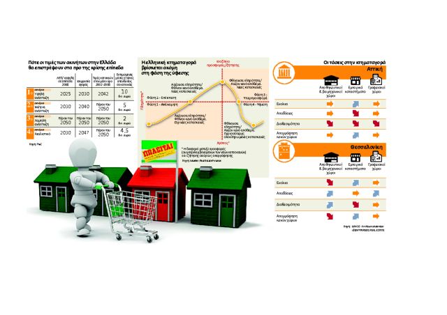 Οπως εκτιμά, σύμφωνα με ένα ρεαλιστικό σενάριο, καθώς το κατά κεφαλήν ΑΕΠ θα επιστρέφει στα προ κρίσης επίπεδα περίπου το 2030, η σύγκλιση προσφοράς και ζήτησης στην κτηματαγορά λόγω της αυξημένης προσφοράς κατοικιών, της υψηλής φορολόγησης και της έλλειψης στεγαστικής πίστης θα σημειωθεί περί το 2047, ενώ οι τιμές των ακινήτων θα ανακάμψουν στον μέσο όρο της περιόδου 2002 – 2008 το σωτήριον έτος 2050.