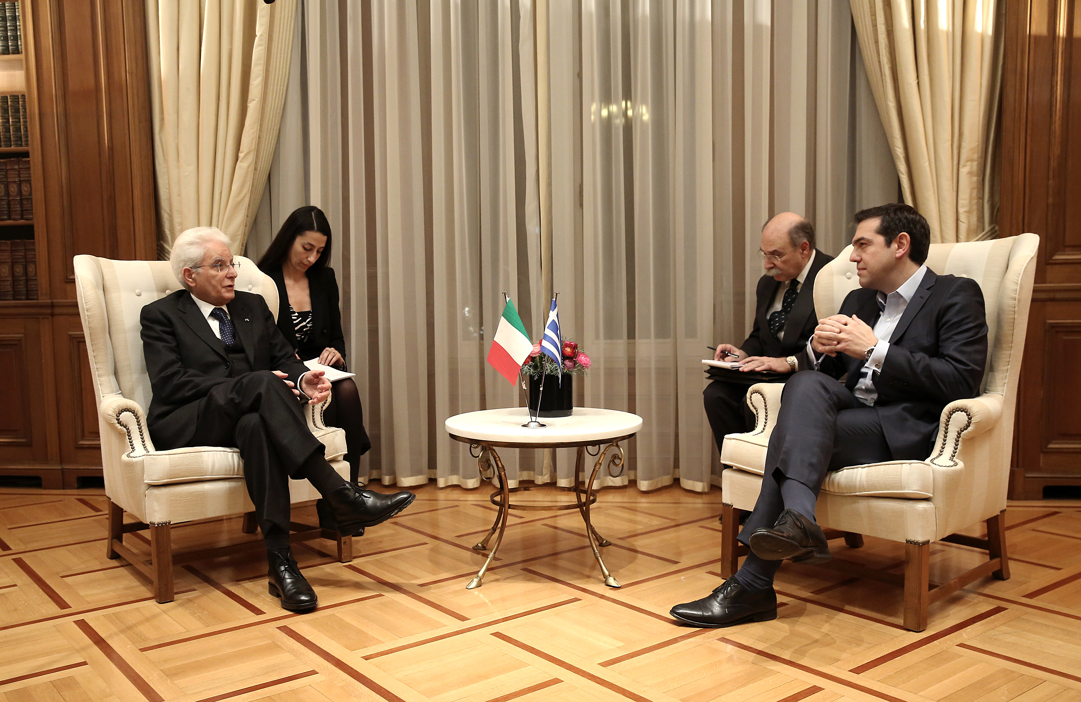 Ο πρωθυπουργός, Αλέξης Τσίπρας, συναντήθηκε με τον Πρόεδρο της Ιταλικής Δημοκρατίας, Σέρτζιο Ματαρέλα, στο Μέγαρο Μαξίμου. Οι δύο ηγέτες τόνισαν τους μακροχρόνιους δεσμούς φιλίας και συνεργασίας που ενώνουν τον ελληνικό και τον ιταλικό λαό, καθώς και τις προοπτικές περαιτέρω εμβάθυνσης της συνεργασίας τόσο σε διμερές όσο και ευρωπαϊκό επίπεδο.
