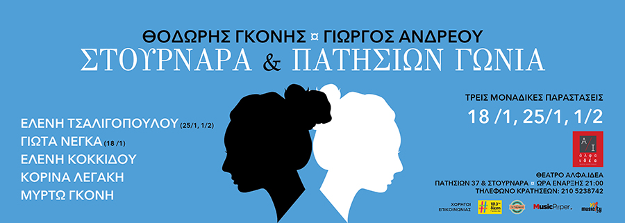 Οκτώ θεατρικοί μονόλογοι και δεκατρία τραγούδια αποτελούν το υλικό της παράστασης «Στουρνάρα και Πατησίων γωνία». Στο προσκλητήριο ερμηνειών ανταποκρίθηκαν οι Ελένη Τσαλιγοπούλου (25/01 και 01/02), Ελένη Κοκκίδου, Γιώτα Νέγκα (18/01), Κορίνα Λεγάκη και Μυρτώ Γκόνη (18/01,25/01,01/02). Η Ελένη Κοκκίδου θα αναλάβει το… βάρος τεσσάρων θεατρικών μονολόγων και δύο τραγουδιών. Η Μυρτώ Γκόνη δύο μονολόγων. Οι άλλες κυρίες την ευθύνη των τραγουδιών ενώ τους εναπομείναντες δύο θεατρικούς μονολόγους θα ερμηνεύσει επί σκηνής ο συγγραφέας των μονολόγων, ποιητής των στίχων της παράστασης και σκηνοθέτης της Θοδωρής Γκόνης. Ο συνθέτης των τραγουδιών και των ορχηστρικών μουσικών της παράστασης Γιώργος Ανδρέου θα παίξει πιάνο. Κοντά του στο τσέλο ο Μιχάλης Πορφύρης. Τον ήχο φροντίζει ο Παναγιώτης Πετρονικολός, τα φώτα ο Τάσος Παλαιορούτας και τα σκηνικά η Ματίνα Μέγκλα. Την αφίσα της παράστασης επιμελείται ο Ανδρέας Γεωργιάδης.