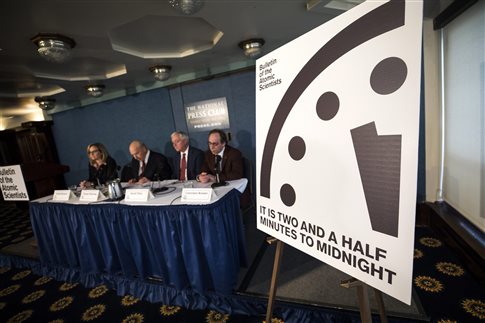 Οι δείκτες του ρολογιού της Αποκάλυψης, που συμβολίζει πόσο επικείμενη είναι η καταστροφή του πλανήτη, μετακινήθηκαν κατά 30 δευτερόλεπτα πιο μπροστά και πλέον δείχνουν 2 λεπτά και 30 δευτερόλεπτα πριν τα μεσάνυχτα, ανακοίνωσαν την Πέμπτη οι επιστήμονες, αναφέροντας μεταξύ των λόγων που οδήγησαν σε αυτήν την κίνηση την εμπρηστική ρητορική του Ντόναλντ Τραμπ.