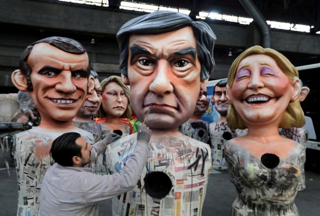 FILE PHOTO: A worker puts the final touches to a giant figure of Francois Fillon (C), former French prime minister, member of The Republicans political party and 2017 presidential candidate of the French centre-right, next to French National Front leader Marine Le Pen (R) and Emmanuel Macron (L), head of the political movement En Marche !, or Onwards !, during preparations for the carnival parade in Nice, France, February 2, 2017. REUTERS/Eric Gaillard/File Photo (File: 2017-02-03T102810Z_1600423857_RC1F37E26090_RTRMADP_3_FRANCE-ELECTION-STOCKS.JPG )
