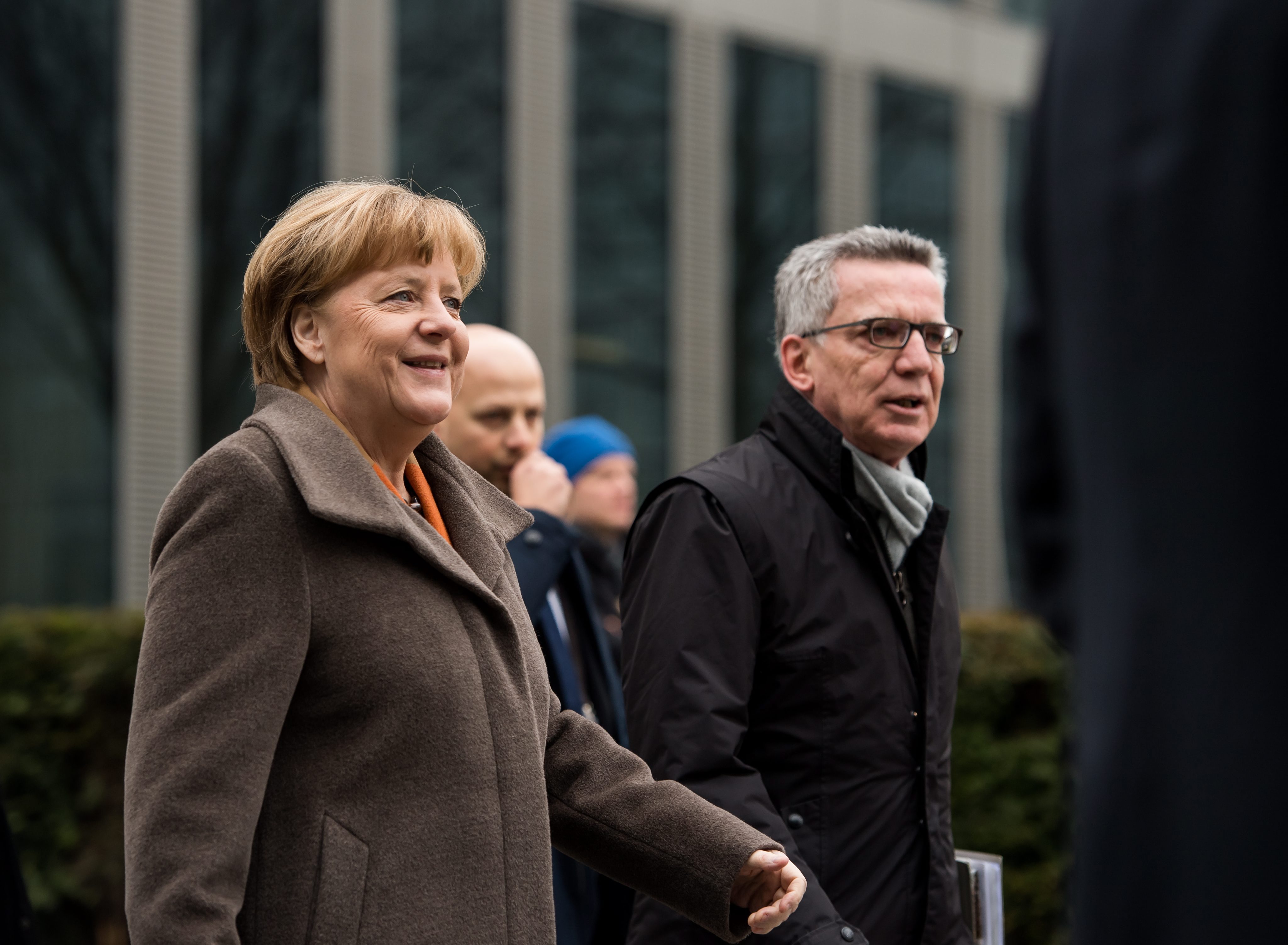 epa05774362 German Chancellor Angela Merkel (L) and German Interior Minister Thomas de Maiziere (R) arrive to a meeting in Munich, Germany, 06 February 2017. The heads of the CDU and CSU parties are set to meet on 05 and 06 February for a 'future meeting' and boardmeeting to discuss their differences over refugee policy. EPA/LUKAS BARTH (File: 17598537.jpg )