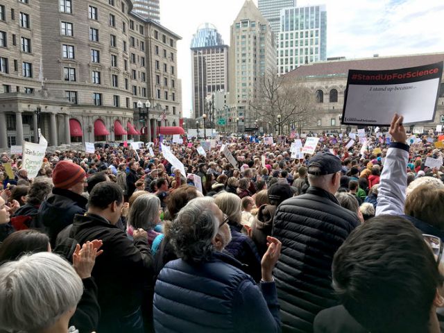 Σε μια πρόβα για τη διαδήλωση που θα πραγματοποιηθεί στην Ουάσινγκτον την Ημέρα της Γης, στις 22 Απριλίου, εκατοντάδες επιστήμονες διαδήλωσαν την Κυριακή στη Βοστόνη, στο πλαίσιο του ετήσιου συνεδρίου της AAAS.