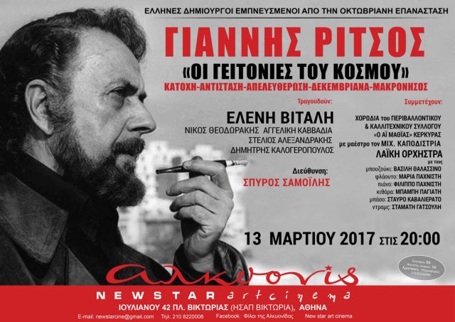 Tην ερχόμενη Δευτέρα, 13 Μαρτίου στις 20.00 στο ΑΛΚΥΟΝΙΣ new star art cinema. θα παρουσιαστεί το σπουδαίο έργο του ποιητή της ρωμιοσύνης Γιάννη Ρίτσου
