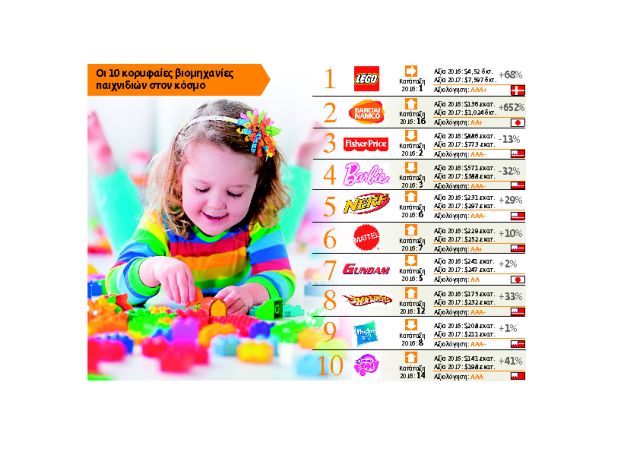 Εχοντας κατακτήσει από το 2016 την πρώτη θέση των επωνυμιών του κλάδου παιχνιδιών παγκοσμίως, το 2017 η δανέζικη βιομηχανία κατάφερε να αυξήσει κατά 68% την αξία της, που έφθασε στα 7,6 δισ. δολάρια, σύμφωνα με την εταιρεία ερευνών Brand Finance. Σημειωτέον ότι στις αξιολογήσεις της η εταιρεία ερευνών δεν λαμβάνει υπόψη της μόνο τον τζίρο και εν γένει τις οικονομικές επιδόσεις των επωνυμιών, αλλά επίσης την επιρροή που έχουν στην κοινωνία τα πιο εμβληματικά προϊόντα τους, τη διεθνή αίγλη της επωνυμίας, τη συμβολή της στην οικονομική ανάπτυξη της χώρας στην οποία εδρεύει και, τέλος, στην εκτίμηση του κόσμου που απολαμβάνει η επιχείρηση.