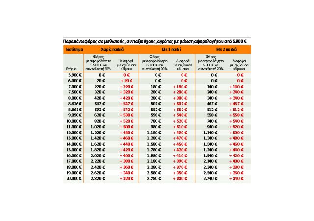 Στην περίπτωση του έγγαμου με 1 παιδί ο πρόσθετος φόρος για κάποιον που δηλώνει ετήσιο εισόδημα 8.863 ευρώ θα είναι της τάξεως των 553 ευρώ, ενώ στην περίπτωση οικογένειας με 2 παιδιά ο πρόσθετος φόρος θα είναι 558 ευρώ.