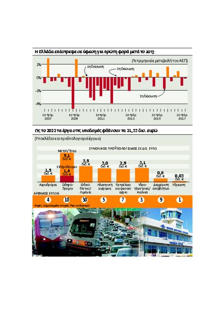 Το διάστημα 2017-2022, σύμφωνα με μελέτη της PwC, συνολικά 69 έργα υποδομών με υπολειπόμενο προϋπολογισμό €21,4 δισ. θα πρέπει να ολοκληρωθούν, αντισταθμίζοντας έτσι μερικώς τον υφεσιακό χαρακτήρα των μέτρων.