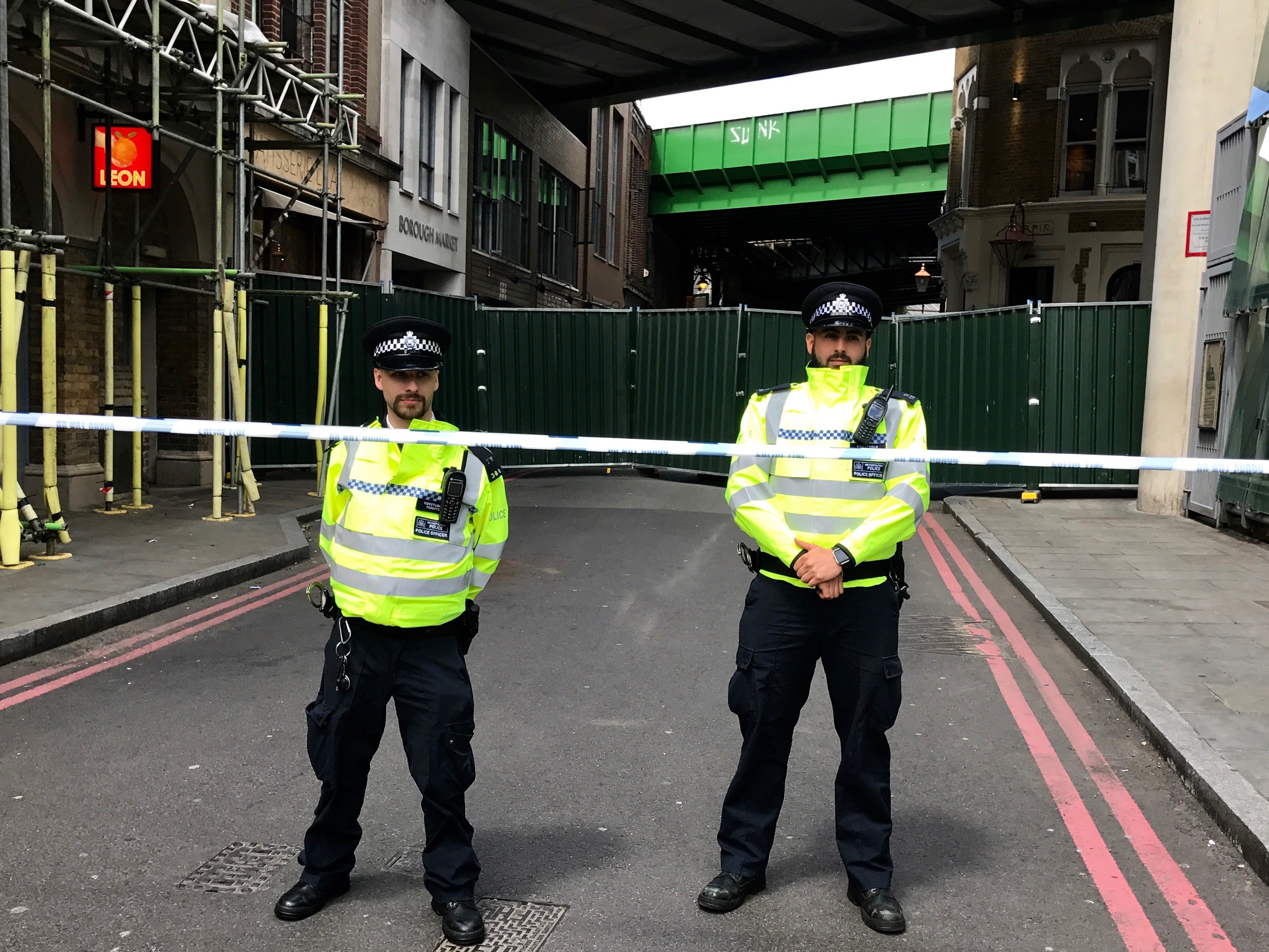 epa06015042 London Metropolitan police officers on duty at one of the entrances to Borough Market, in London, Britain, 07 June 2017. Eight people lost their lives and 48 people were injured after three attackers drove a van into crowds on London Bridge and then went on a stabbing rampage in Borough Market in London on 03 June 2017. EPA/ANDRE PAIN (File: 18079622.jpg )