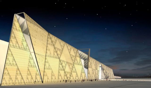Το κτίριο θα έχει σχήμα βέλους και θα δείχνει προς τις πυραμίδες. Με τους αλαβάστρινους τοίχους του, θα γυαλίζει σαν διαμάντι κάτω από τον αιγυπτιακό ήλιο.