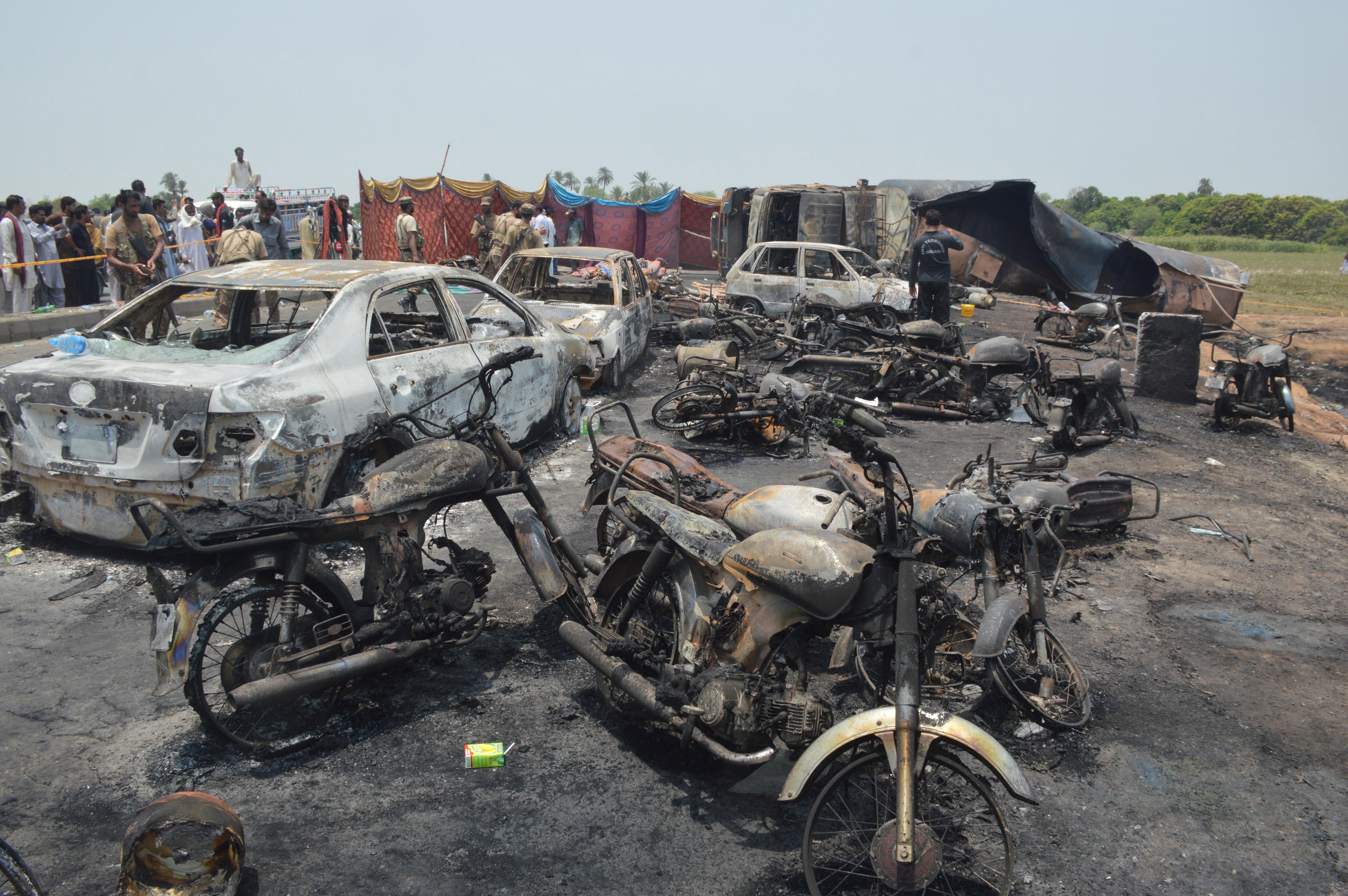 Το βυτιοφόρο ανατράπηκε αφού προσπάθησε να κάνει μια απότομη στροφή σε αυτοκινητόδρομο στα περίχωρα της πόλης Μπαχαβαλπούρ, στο κέντρο του Πακιστάν. Μεγάλο πλήθος ανθρώπων είχε συγκεντρωθεί στο σημείο του ατυχήματος όταν το όχημα έπιασε φωτιά και εξερράγη, δήλωσαν διασώστες.