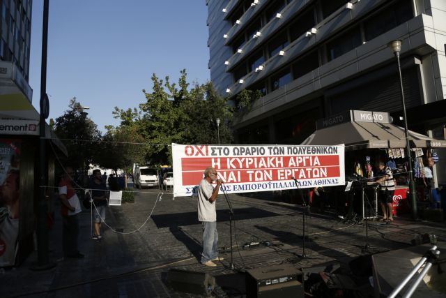 Οι συγκεντρωμένοι ύψωσαν πανό κατά της κατάργησης της αργίας τις Κυριακές ενώ διένειμαν φυλλάδια σε πολίτες και καταστηματάρχες.