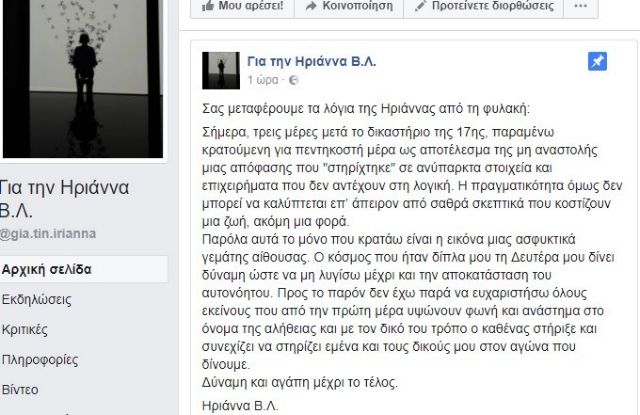 Mέσω μιας σελίδας στο facebook που έχει δημιουργηθεί για εκείνη η Ηριάννα Β.Λ. έστειλε την Πέμπτη το πρωί μήνυμα από τη φυλακή προς όλους όσοι της συμπαραστέκονται.