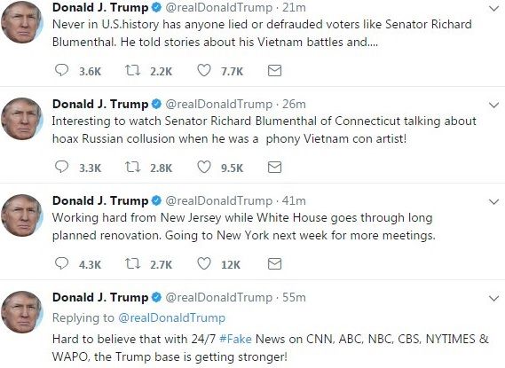 Στην Ουάσινγκτον ξημέρωσε η 200ή ημέρα ηγεσίας του Ντόναλντ Τραμπ, και ο πρόεδρος έπιασε από το πρωί το Twitter. Φρόντισε με τις αναρτήσεις να τιμήσει τη φήμη του: Εξαπέλυσε το πιο οργισμένο μπαράζ μηνυμάτων του από την ανάληψη της προεδρίας, επιτεθέμενος από τα «χρεοκοπημένα ΜΜΕ των fake news» μέχρι γερουσιαστή που τον επέκρινε, λέγοντας πως (ο γερουσιαστής) «έκλαιγε σαν μωρό και ικέτευε για συγχώρεση σαν παιδάκι».