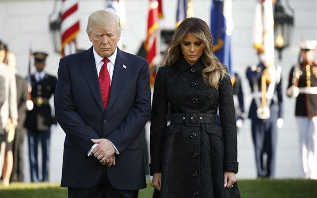 Εν μέσω συνεργατών ο Ντόναλντ και η Μελάνια Τραμπ στάθηκαν σιωπηλοί σε στάση προσοχής στους κήπους του Λευκού Οίκου στις 08:46 τοπική ώρα (15:46 ώρα Ελλάδας), όταν το πρώτο επιβατικό αεροπλάνο, του οποίου την πορεία εξέτρεψαν μέλη της τρομοκρατικής οργάνωσης Αλ Κάιντα, έπεσε πάνω σε έναν από τους δύο πύργους του Παγκόσμιου Κέντρου Εμπορίου (WTC) στη Νέα Υόρκη.