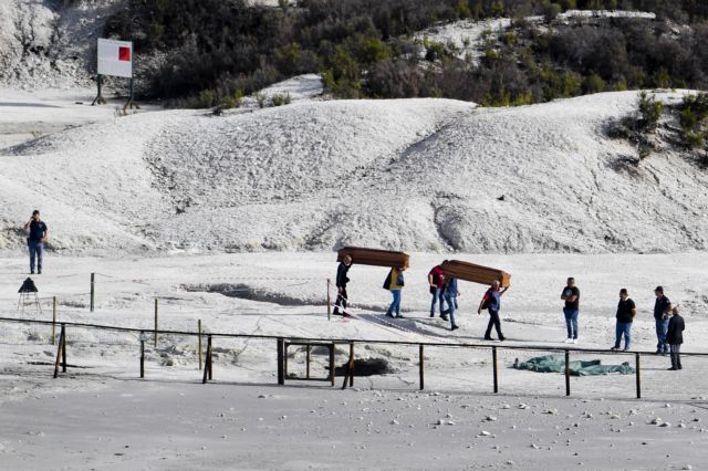 Πυροσβέστες ανέσυραν τις σορούς τριών ανθρώπων από την τρύπα που άνοιξε και δεν είχε μεγάλο βάθος, σε τμήμα του κρατήρα του ηφαιστείου Σολφατάρα, ο οποίος περιβάλλεται από ξύλινη περίφραξη προκειμένου να μην προσεγγίζουν οι τουρίστες.