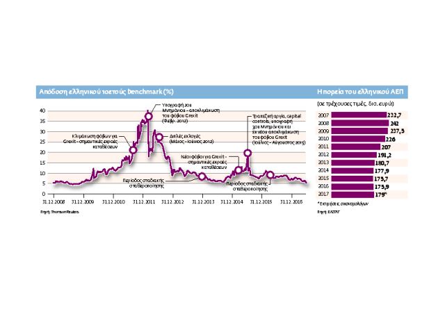 Μπορεί οι περισσότεροι οικονομολόγοι να προβλέπουν, λόγω της χαμηλής βάσης εκκίνησης, ανάπτυξη 1,5%-2% εφέτος και 2,6%-2,8% το 2018, εντούτοις η Ελλάδα είναι η μόνη χώρα της λεγόμενης περιφέρειας της ευρωζώνης που, αν και έχασε το 26,5% του ΑΕΠ, παραμένει σε στενωπό, ενώ χώρες όπως η Ιρλανδία, η Κύπρος και η Πορτογαλία, όχι μόνο κατάφεραν να εξέλθουν των μνημονίων, αλλά έχουν σε μεγάλο βαθμό ανακτήσει ή και ξεπεράσει (π.χ. το ΑΕΠ της Ιρλανδίας είναι πια 40% μεγαλύτερο) την απώλεια του ΑΕΠ που σημειώθηκε στη διάρκεια της κρίσης.