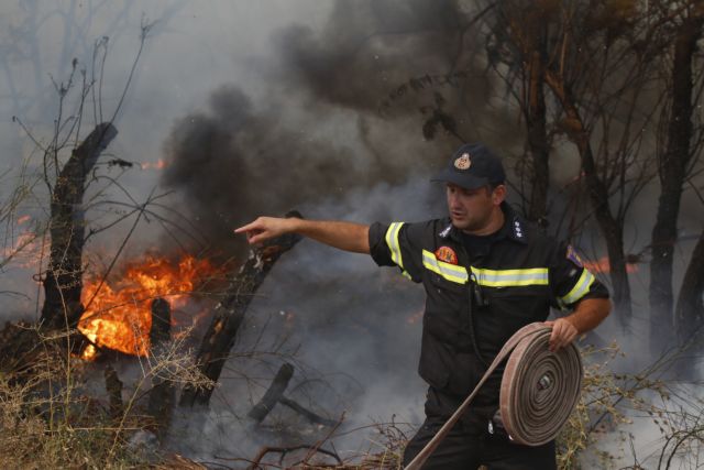 Σύμφωνα με την Πυροσβεστική, το πύρινο μέτωπο βρίσκεται σε δύσβατο σημείο μέσα σε χαράδρα και στην περιοχή επιχειρούν ισχυρές επίγειες δυνάμεις.