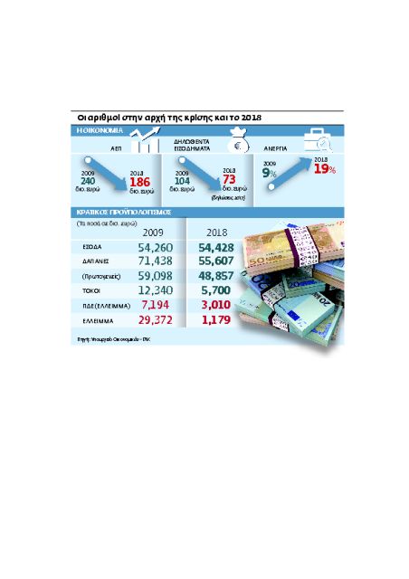 Συγκρίνοντας τα βασικά μεγέθη των προϋπολογισμών του 2009 (όπως έκλεισε), που ήταν η αρχή της κρίσης, και του 2018 διαπιστώνει κανείς τα εξής: