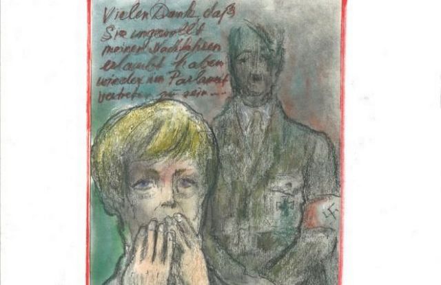 Το σκίτσο, που αναμένεται να δημοσιευθεί το Σάββατο στο ένθετο μηνιαίο περιοδικό της εφημερίδα «Frankfurter Allgemeine Zeitung», σύμφωνα με δημοσίευμα του WWD εμφανίζεται ο Αδόλφος Χίτλερ να λέει στη Μέρκελ: «Σε ευχαριστώ πολύ που επέτρεψες ακούσια στους απογόνους μου να εκπροσωπηθούν στο Κοινοβούλιο». Η Άνγκελα Μέρκελ σε κατάσταση αλλοφροσύνης ρωτά: «Τι έχω κάνει»;