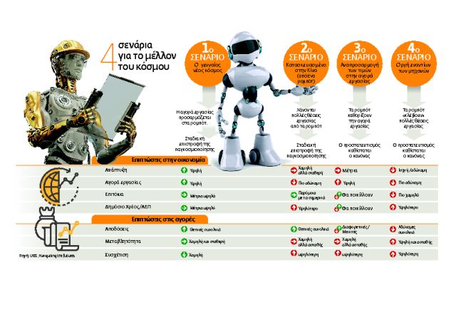 1ο ΣΕΝAΡΙΟ. Ο θαυμάσιος νέος κόσμος: Η αγορά εργασίας προσαρμόζεται στα ρομπότ. Η παγκοσμιοποίηση επιστρέφει. Η δυναμική του προστατευτισμού υποχωρεί, ενώ η ελεύθερη κυκλοφορία των κεφαλαίων και η άνοδος του εμπορίου κυριαρχούν. Η αγορά εργασίας προσαρμόζεται στην εμφάνιση της ρομποτικής, με νέες θέσεις και νέες μορφές εργασίας να εξασφαλίζουν υψηλή απασχόληση. Η παραγωγικότητα ανεβαίνει, καθώς το εργατικό δυναμικό μαθαίνει να εκμεταλλεύεται τη δύναμη της τεχνητής νοημοσύνης και της ρομποτικής. Οι μισθοί αυξάνονται, καθώς η τεχνολογία δημιουργεί νέες θέσεις εργασίας, ενώ η παγκοσμιοποίηση επιστρέφει.