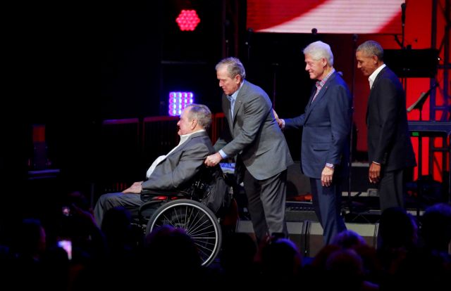 Σε μια σπάνια επίδειξη ενότητας, οι πέντε τελευταίοι πρόεδροι των ΗΠΑ εμφανίστηκαν ο ένας δίπλα στον άλλον πάνω σε μουσική σκηνή στο Τέξας, το βράδυ του Σαββάτου, για μια συναυλία που δόθηκε για τη συγκέντρωση χρημάτων υπέρ των θυμάτων των κυκλώνων που έπληξαν τη νότια πλευρά της χώρας και την Καραϊβική.