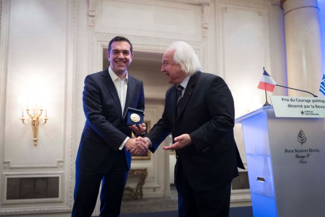 «Στον ελληνικό λαό ανήκει το βραβείο αυτό και εγώ το παραλαμβάνω στο όνομά του»: με τα λόγια αυτά ο έλληνας πρωθυπουργός παρέλαβε το βραβείο «Πολιτικού σθένους» που του απένειμε το πρωί της Πέμπτης ο Πατρίκ Πατρίκ Βάσμαν, ιδρυτής του περιοδικού Politique Internationale, ύστερα από μια παρουσίαση της κυβερνητικής του δράσης.