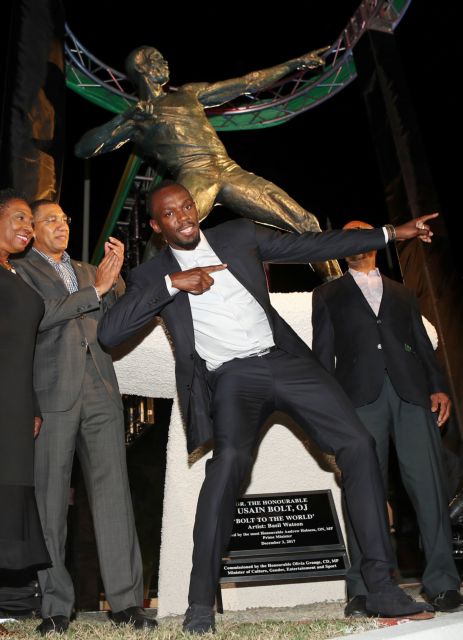 Τα αποκαλυπτήρια ενός μεγάλου μπρούτζινου αγάλματος του Γιουσέιν Μπολτ έγιναν στο εθνικό στάδιο του Κίνγκστον, με δημιουργό τον Μπασίλ Γουότσον. Ο Μπολτ εμφανίζεται στην κλασική στάση που τον είχαν συνηθίσει οι φίλοι του στίβου μετά από κάθε νίκη του, να σχηματίζει τον κεραυνό με το αριστερό χέρι τεντωμένο μπροστά, δείχνοντας την κατάκτηση της κορυφής του κόσμου, και το δεξί τραβηγμένο πίσω.