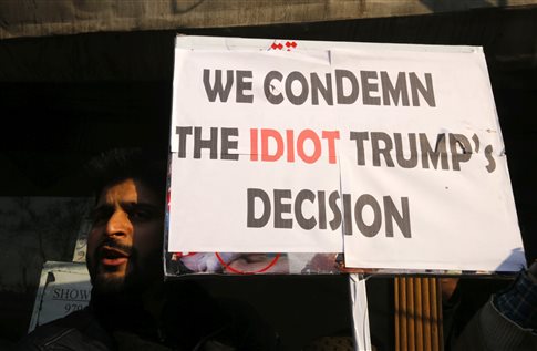 Χιλιάδες Παλαιστίνιοι κατέβηκαν, την Πέμπτη, στους δρόμους πόλεων της Δυτικής Όχθης και της Λωρίδας της Γάζας κι έκαψαν σημαίες των ΗΠΑ και του Ισραήλ, ενώ ακολούθησαν άγριες συγκρούσεις με τις ισραηλινές δυνάμεις ασφαλείας με αποτέλεσμα να τραυματιστούν τουλάχιστον 22 άτομα από πραγματικά πυρά και σφαίρες από καουτσούκ μόνο στη Δυτική Όχθη, σύμφωνα με την Παλαιστινιακή Ερυθρά Ημισέληνο.