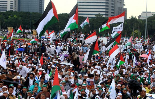 Περίπου 80.000 Ινδονήσιοι, σύμφωνα με την αστυνομία, συγκεντρώθηκαν μπροστά από το Εθνικό Μνημείο, έναν πύργο στο κέντρο της πρωτεύουσας, υψώνοντας παλαιστινιακές σημαίες και πλακάτ που έγραφαν “απελευθέρωση της Παλαιστίνης”.