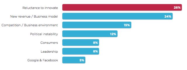 Η απάντηση από τους περισσότερους ήταν «απροθυμία για καινοτομία» (26%), ακολουθούμενη από την αδυναμία εξεύρεσης νέων οικονομικών πόρων και ενός βιώσιμου επιχειρηματικού μοντέλου (24%). Το 15% θεωρεί κίνδυνο τα ανταγωνιστικά ΜΜΕ, το 12% την πολιτική αστάθεια, το 8% τη συρρίκνωση του καταναλωτικού κοινού, και μόλις το 5% ανέφερε ως κίνδυνους για τα μέσα ενημέρωσης τη Google και το Facebook.