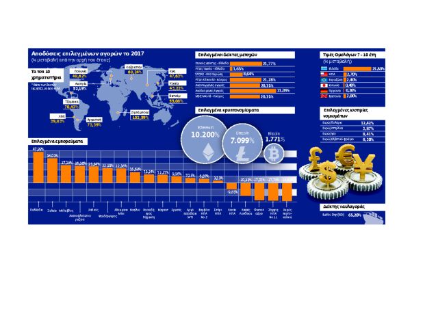 Αποδόσεις που ξεπέρασαν ακόμα και το 10.000% σημειώθηκαν το 2017, ένα έτος που σε ορισμένες περιπτώσεις, όπως αυτή των κρυπτονομισμάτων, τα κέρδη εξέπληξαν επενδυτές και αναλυτές, καθώς η συγκυρία ευνοεί τα ενεργητικά σχετικά αυξημένου κινδύνου.