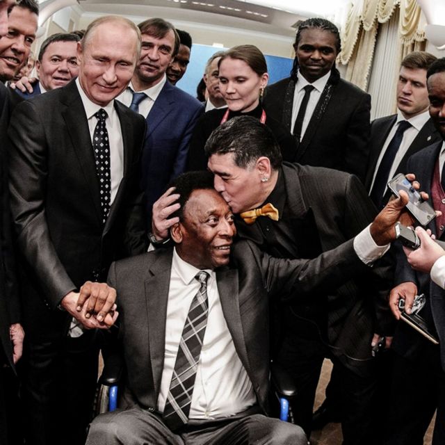 Κάπου εκεί, βρίσκεται κι ένας ακόμη «ζωντανός θρύλος» της «στρογγυλής θεάς», ο -για πολλούς- κορυφαίος ποδοσφαιριστής όλων των εποχών. Το «μαύρο διαμάντι», ο Βραζιλιάνος Εντσον Αράντες Ντο Νασιμέντο ή απλά ο Πελέ… Καθηλωμένος σε αναπηρικό καροτσάκι, λόγω προβλημάτων υγείας, αλλά πάντα χαμογελαστός, συνομιλεί με τον Πούτιν και αξιωματούχους οι οποίοι σπεύδουν να τον χαιρετήσουν. Και σε κάποια στιγμή, συμβαίνει αυτό που… «παρακαλούν» να συμβεί κάποια στιγμή στην καριέρα τους, οι επαγγελματίες φωτογράφοι και εικονολήπτες.