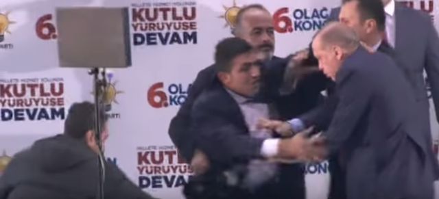 Η «επίθεση αγάπης» που δέχτηκε από κάποιον ένθερμο υποστηρικτή του φαίνεται ότι αναστάτωσε τον Ρετζέπ Ταγίπ Ερντογάν κατά τη διάρκεια ομιλίας του.