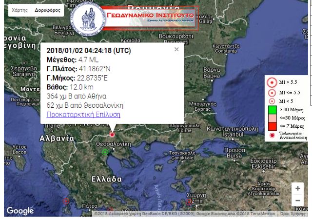 «Σμήνος» σεισμικών δονήσεων καταγράφηκαν κατά τη διάρκεια της νύχτας βόρεια-βορειοδυτικά του Κιλκίς, σύμφωνα με το Γεωδυναμικό Ινστιτούτο του Εθνικού Αστεροσκοπείου Αθηνών. Ο μεγαλύτερος, σημειώθηκε στις 6.24 το πρωί και είχε ένταση 4,7 βαθμών της κλίμακας Ρίχτερ.
