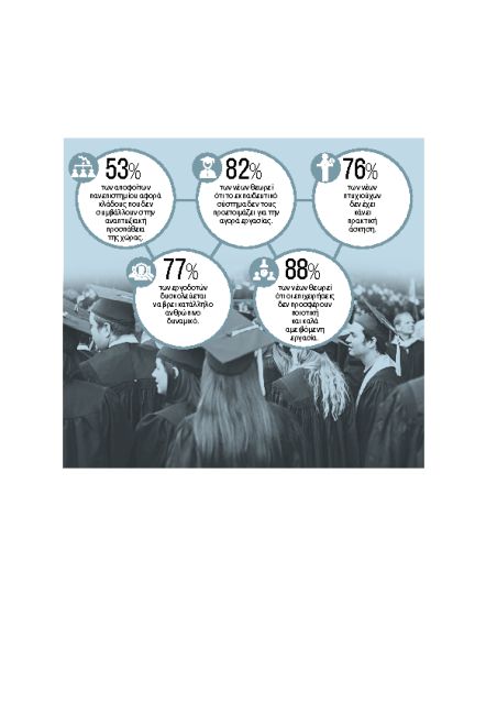 Το 53% των αποφοίτων των ελληνικών πανεπιστημίων ολοκληρώνει ετησίως προγράμματα σπουδών που έχουν ελάχιστες προοπτικές επαγγελματικής αποκατάστασης ή αφορούν τομείς που δεν συμβάλλουν με κανέναν τρόπο στην ανάγκη της χώρας για ανάπτυξη. Οπως λένε στο «Βήμα» οι επιστημονικοί υπεύθυνοι μελέτης που εκπόνησαν πρόσφατα το Οικονομικό Πανεπιστήμιο Αθηνών και η Endeavor Greece, «παρά τα πρωτοφανή ποσοστά ανεργίας, οι περισσότεροι εργοδότες στη χώρα μας δηλώνουν δυσκολία να βρουν το κατάλληλο ανθρώπινο δυναμικό για να καλύψουν συγκεκριμένες θέσεις απασχόλησης».