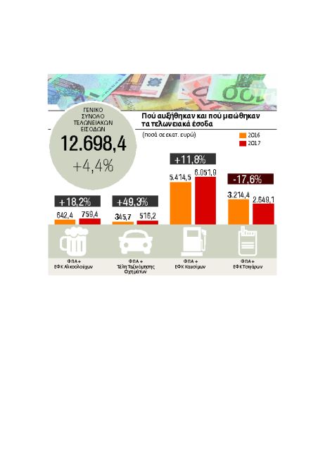 Σύμφωνα με τα στοιχεία που έχει στη διάθεσή του «Το Βήμα της Κυριακής» και παρουσιάζει σήμερα, από τα έσοδα των τελωνείων του 2017, σε σύγκριση με το 2016, προκύπτουν δύο σημαντικά αποτελέσματα. Πρώτον, ότι οι πολίτες πλήρωσαν το περασμένο έτος παραπάνω Ειδικούς Φόρους Κατανάλωσης και ΦΠΑ καυσίμων 637 εκατ. ευρώ ως αποτέλεσμα της αύξησης των φορολογικών συντελεστών και όχι λόγω της αύξησης της κατανάλωσης. Δεύτερον, ότι τα τελωνειακά έσοδα του κράτους από την αύξηση της φορολογίας στα τσιγάρα σημείωσαν μείωση αντί για αύξηση, προκαλώντας πονοκέφαλο στο οικονομικό επιτελείο της κυβέρνησης για τη λάθος συνταγή που εφαρμόζει και δυσαρέσκεια στους πολίτες που, ενώ πληρώνουν ακριβότερα τα τσιγάρα, στο τέλος το κράτος εισπράττει λιγότερα καθώς ανθεί το λαθρεμπόριο και οι πωλήσεις μειώνονται.