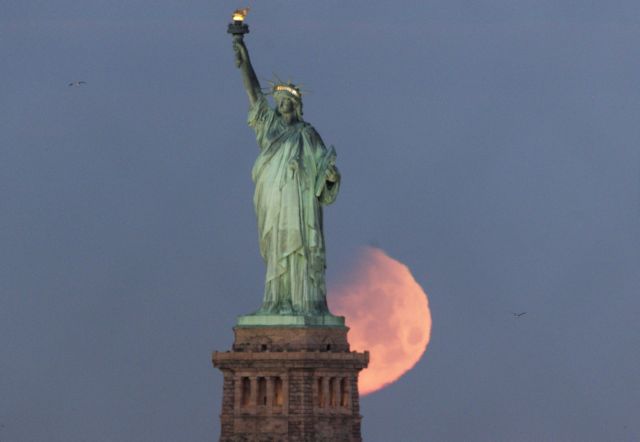 Χιλιάδες άνθρωποι συγκεντρώθηκαν στην Καλιφόρνια για να δουν τη Σελήνη να χάνεται, κρυμμένη από τη σκιά της Γης και μετά να επανεμφανίζεται κατακόκκινη, εξ ου και η ονομασία “ματωμένο φεγγάρι”.