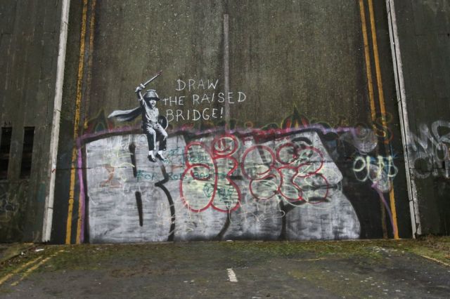 Σε μια μόνιμα σηκωμένη γέφυρα (δεν χρησιμοποιείται, πλέον), ένα παιδάκι, φορώντας ένα σουρωτήρι για περικεφαλαία και κρατώντας ένα κατσαρολικό γι’ ασπίδα, υψώνει στον αέρα ένα ξύλινο σπαθάκι με ένα μολύβι στην άκρη του. Δίπλα στη ζωγραφιά, η φράση «DRAW THE RAISED BRIDGE!». Κι ο Μπάνκσι επιβεβαίωσε ότι είναι δημιούργημά του αναρτώντας, το περασμένο Σάββατο, μια φωτογραφία του έργου στον λογαριασμό του στο Instagram.