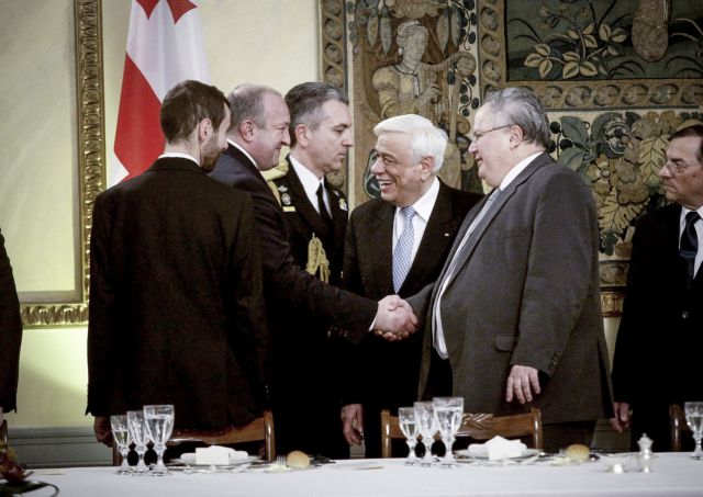 Ηταν ίσως το σημαντικότερο πηγαδάκι αυτό που σχηματίστηκε το βράδυ της Τσικνοπέμπτης στο Προεδρικό Μέγαρο, στο περιθώριο του επίσημου δείπνου που παρέθεσε ο Πρόεδρος της Δημοκρατίας Πρ. Παυλόπουλος προς τιμήν του προέδρου της Γεωργίας Giorgi Margvelashvili (από όπου και η φωτογραφία). Σε μια γωνιά της τεράστιας αίθουσας τελετών του Προεδρικού βρέθηκαν να συνομιλούν μακριά από κάμερες ο υπουργός Εξωτερικών Ν. Κοτζιάς, ο τομεάρχης Εξωτερικών της ΝΔ Γιώργος Κουμουτσάκος και ο πρώην υπουργός Εξωτερικών στις κυβερνήσεις Καραμανλή Πέτρος Μολυβιάτης. Προτού σας πω τι συζητήθηκε, ας δούμε πώς βρέθηκαν στο Προεδρικό οι Κοτζιάς και Κουμουτσάκος.