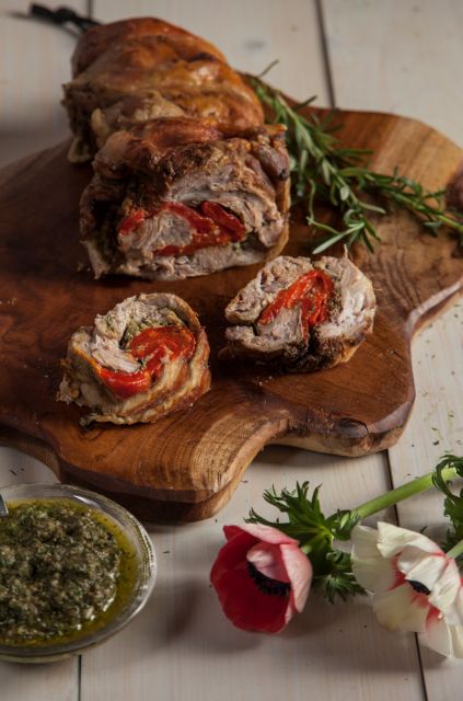 Στρώνουμε σε λαδόκολλα ανοιγμένη τη σπάλα του αρνιού και την αλείφουμε με το πέστο και τη μουστάρδα. Αραδιάζουμε στο κέντρο τις πιπεριές και πασπαλίζουμε με το σκόρδο. Αλατίζουμε και τυλίγουμε το κρέας σε ρολό. Το δένουμε και το τυλίγουμε με τη λαδόκολλα. Το βάζουμε στον φούρνο μέσα σε ταψάκι και ψήνουμε για 1 ώρα και 20′. Κατόπιν, αφαιρούμε τη λαδόκολλα και ψήνουμε στη σχάρα του φούρνου για 25′ στους 175 °C με ένα ταψάκι με νερό στη βάση του φούρνου. Μεταφέρουμε το ρολό σε πιατέλα και κόβουμε σε φέτες.