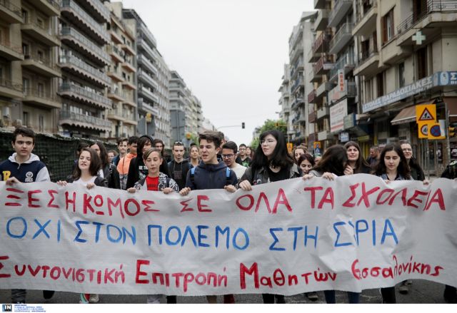 Αντιπολεμικό συλλαλητήριο και πορεία πραγματοποίησαν τη Δευτέρα σύλλογοι φοιτητών του ΑΠΘ και μαθητές από γυμνάσια και λύκεια της Θεσσαλονίκης, καταδικάζοντας την πυραυλική επίθεση ΗΠΑ, Βρετανίας και Γαλλίας ενάντια στη Συρία.