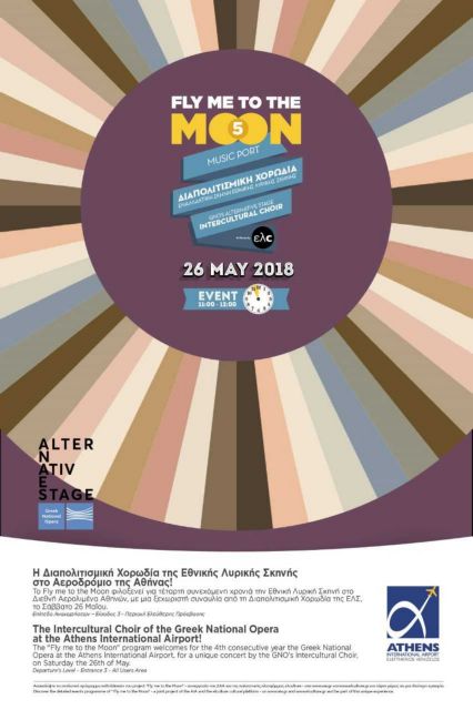 Μια μελωδική έκπληξη περιμένει όσους βρεθούν στο αεροδρόμιο Ελεύθεριος Βενιζέλος το πρωί του Σαββάτου 26Μαΐου.Για τέταρτη συνεχόμενη χρονιά ο Διεθνής Αερολιμένας Αθηνών υποδέχεται, στο πλαίσιο του προγράμματος Fly me to the Moon, τη Διαπολιτισμική Χορωδία της Εθνικής Λυρικής Σκηνής για μια ξεχωριστή συναυλία, που θα «ταξιδέψει» τους επισκέπτες και επιβάτες που θα βρεθούν εκεί 11.00 με 12.00, σε άλλες χώρες και πολιτισμούς.