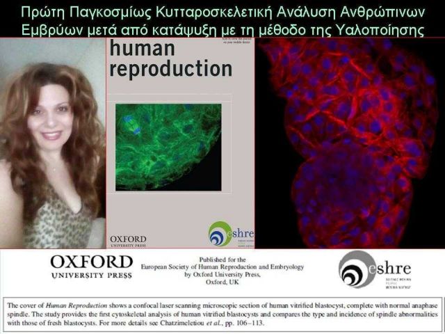 Η τιμώμενη πραγματοποίησε εφαρμογή για πρώτη φορά παγκοσμίως, κυτταροσκελετικής ανάλυσης φρέσκων ανθρωπίνων εμβρύων σε όλα τα στάδια της προεμφυτευτικής ανάπτυξης και εφαρμογή για πρώτη φορά παγκοσμίως κυτταροσκελετικής ανάλυσης ανθρωπίνων εμβρύων μετά από κατάψυξη με τη μέθοδο της υαλοποίησης.
