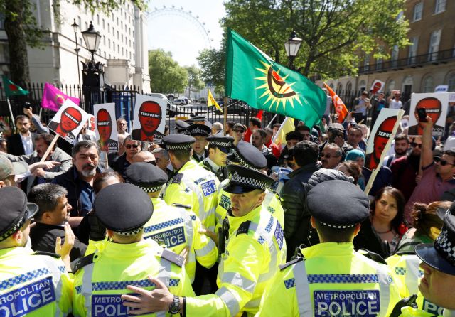 Οι Κούρδοι είχαν μαζευτεί από νωρίς στην Ντάουνιγκ Στριτ διαμαρτυρόμενοι για τη συνάντηση του Τούρκου Προέδρου με την Βρετανίδα Πρωθυπουργό Τερέζα Μέι το απόγευμα, όταν οπαδοί του Ερντογάν έκαναν την ίδια ώρα αντιδιαδήλωση.
