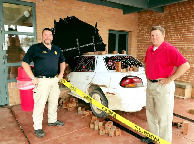 Οι τελειόφοιτοι πήραν ένα παλιό άσπρο αμάξι, και χρησιμοποιώντας μαύρη κολλητική ταινία και μαύρο μουσαμά, το έκαναν να μοιάζει ότι καρφώθηκε στον τοίχο. «Ράντισαν» ένα γύρω και με τούβλα που, κατά την πρόσκρουση, τινάχτηκαν απ’ τον κατεστραμμένο τοίχο. Στα παράθυρα του αυτοκινήτου είχαν γράψει συνθήματα: «C-ya May 19, 2018! (See you, May 19, 2018, Τα λέμε 19 Μαΐου του 2018)» και «CHS Class of 2018 We’re Busting Out (Τάξη του 2018 στο Λύκειο του Κάμπερλαντ Φεύγουμε, χαλώντας)».