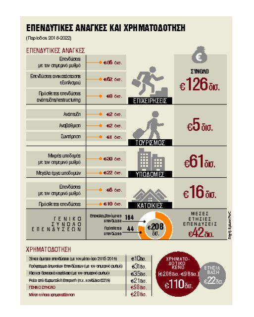 Οι επενδυτικές ανάγκες της χώρας, για να στηριχθεί πραγματική οικονομική μεγέθυνση 3%-4% ετησίως, εκτιμώνται σε 208 δισ. ευρώ για την πενταετία 2018-2022, καθώς οι επενδυτικές ανάγκες στις επιχειρήσεις υπολογίζονται σε 126 δισ. ευρώ, στον τουρισμό σε 5 δισ. ευρώ, στις υποδομές σε 61 δισ. ευρώ και στις κατοικίες σε 16 δισ. ευρώ. Οι προβλεπόμενες ροές χρηματοδότησης όμως για την ίδια περίοδο περιορίζονται στα 98 δισ. ευρώ, δημιουργώντας ένα αθροιστικό χρηματοδοτικό κενό της τάξης των 110 δισ. ευρώ.