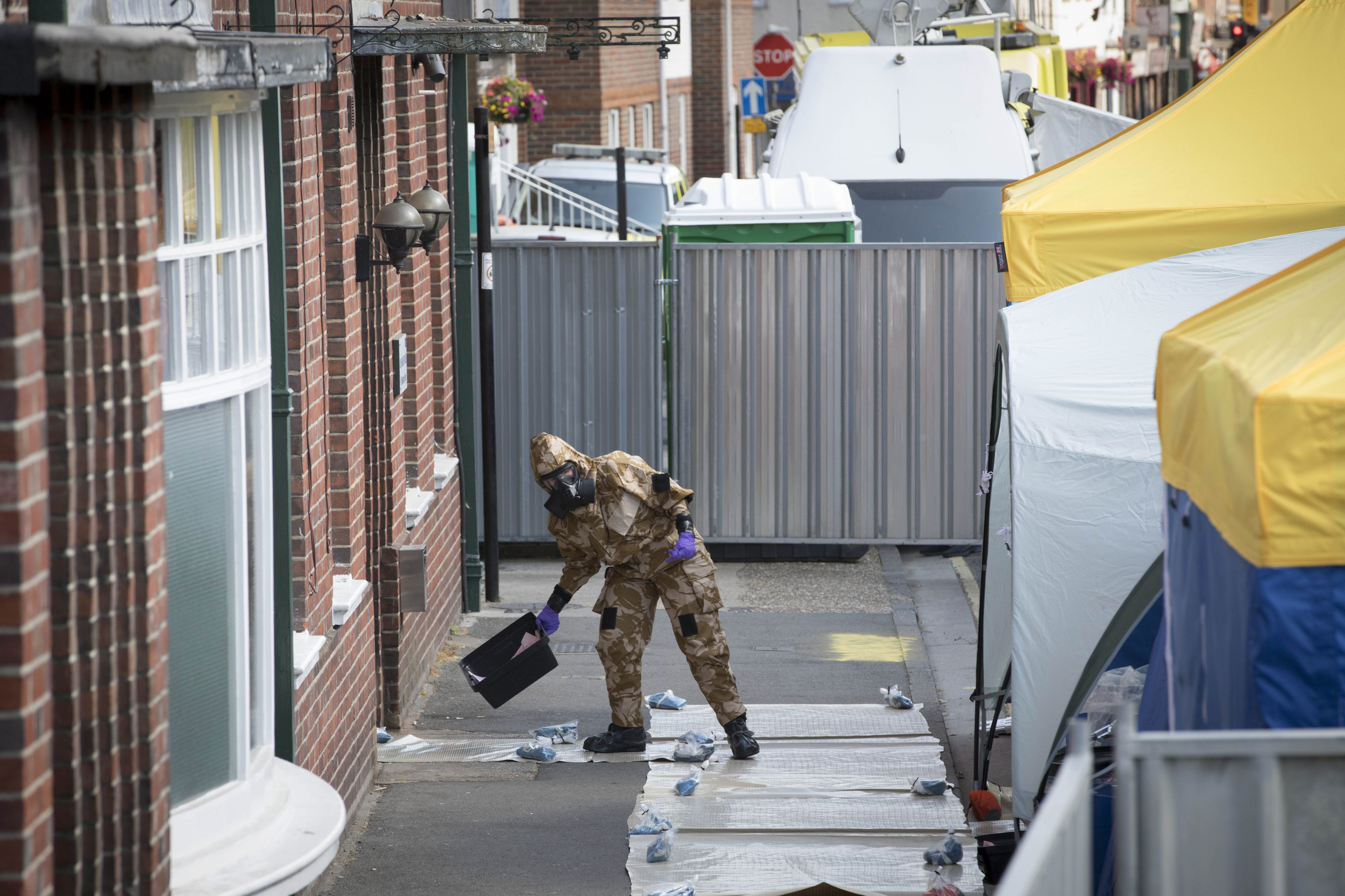 epa06868804 A Forensics officer, wearing protective equipment, at John Baker House, a supported housing scheme for the homeless in Salisbury, Wiltshire, Britain, 06 July 2018. Police state they are investigating a major incident in the Amesbury area of Wiltshire after a woman, aged 44, and a man, aged 45, who are both local to the area and are British nationals, were hospitalised on 30 June 2018, following their potential exposure to an unknown substance. A number of scenes, believed to be the areas the individuals frequented in the period before they fell ill, remain cordoned off in and around the Amesbury and Salisbury area as a precautionary measure. These include, Queen Elizabeth Gardens in Salisbury. A property at John Baker House, Rolleston Street, Salisbury. A property on Muggleton Road, Amesbury. Boots the Chemist, Stonehenge Walk, Amesbury. Amesbury Baptist Centre on Butterfield Drive, Amesbury. The Defence Science and Technology Laboratory at Porton Down confirmed to police that the man and woman had been exposed to the nerve agent Novichok. EPA/RICK FINDLER (File: 19758813.jpg )