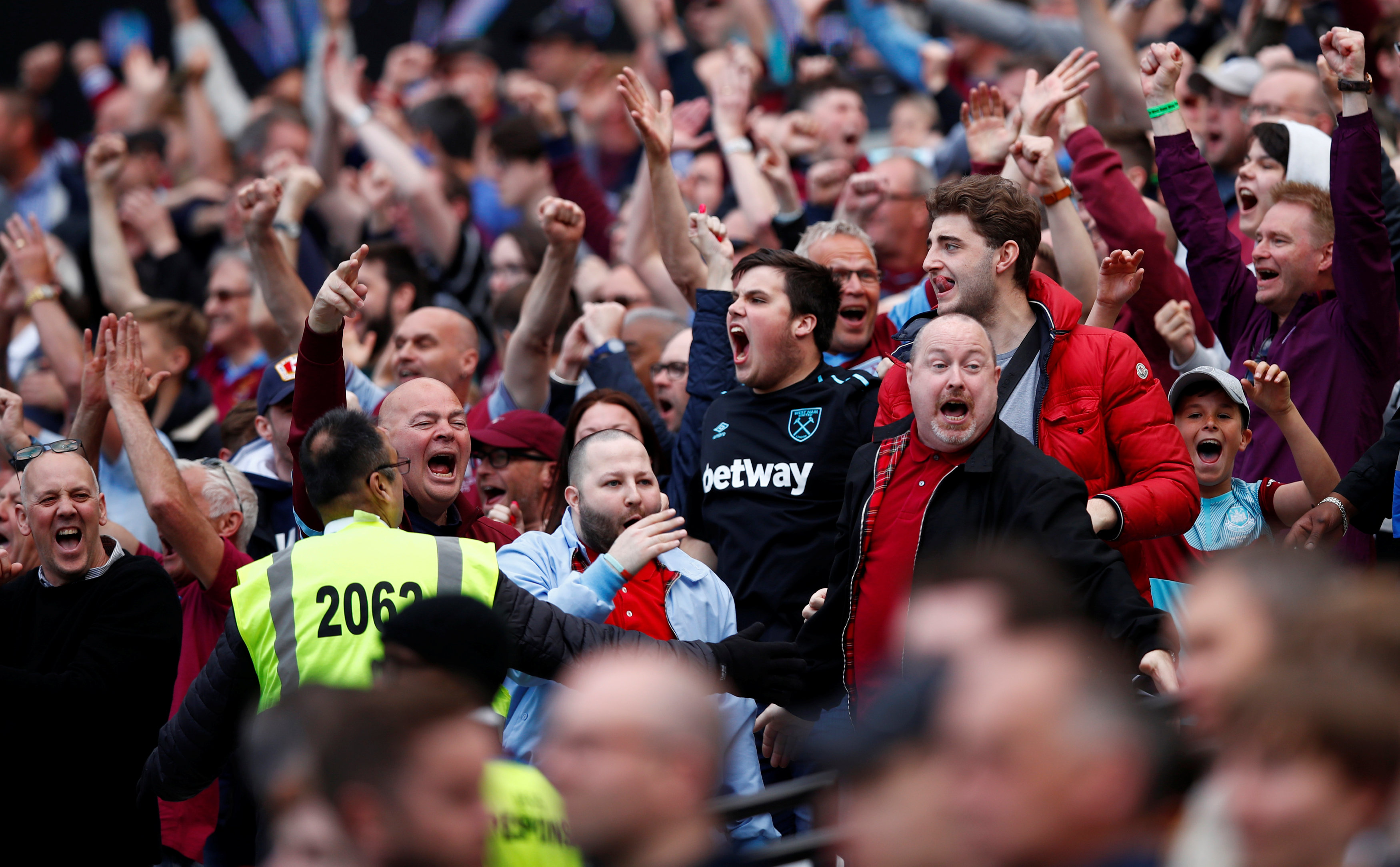 Soccer Football - Premier League - West Ham United vs Everton - London Stadium, London, Britain - May 13, 2018 West Ham United fans during the game REUTERS/Eddie Keogh EDITORIAL USE ONLY. No use with unauthorized audio, video, data, fixture lists, club/league logos or "live" services. Online in-match use limited to 75 images, no video emulation. No use in betting, games or single club/league/player publications. Please contact your account representative for further details. (File: 2018-05-13T155343Z_370712228_RC1B654A8550_RTRMADP_3_SOCCER-ENGLAND-WHU-EVE.JPG )