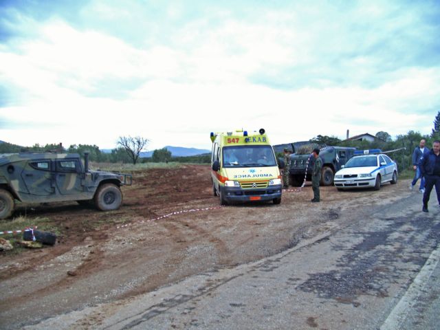Ασθενοφόρο, στρατιωτικά οχήματα και όχημα της αστυνομίας κοντά στο σημείο που συνέβη το δυστύχημα στο πεδίο ασκήσεων «Γλαφυρων» Μαγνησίας, Τρίτη 7 Οκτωβρίου 2014. Δύο επαγγελματίες οπλίτες Πεζικού και ένας οπλίτης θητείας, έχασαν τη ζωή τους στο πεδίο ασκήσεων «Γλαφυρων» Μαγνησίας, όταν κατά την πραγματοποίηση προγραμματισμένων βολών βαρέων όπλων Πεζικού, με όλμους 81 χιλ, διερράγη ο σωλήνας όλμου, όπως ανακοίνωσε το Γενικό Επιτελείο Στρατού. Τραυματίστηκε επίσης ένας αξιωματικός, με τραύμα στο κοιλιακό τοίχωμα εξωτερικά, ο οποίος μεταφέρθηκε στο Νοσοκομείο Βόλου, και είναι εκτός κινδύνου. ΑΠΕ ΜΠΕ/ΑΠΕ ΜΠΕ/ΗΛΙΑΣ ΚΑΡΑΤΣΑΛΟΣ (File: 14539079.JPG )