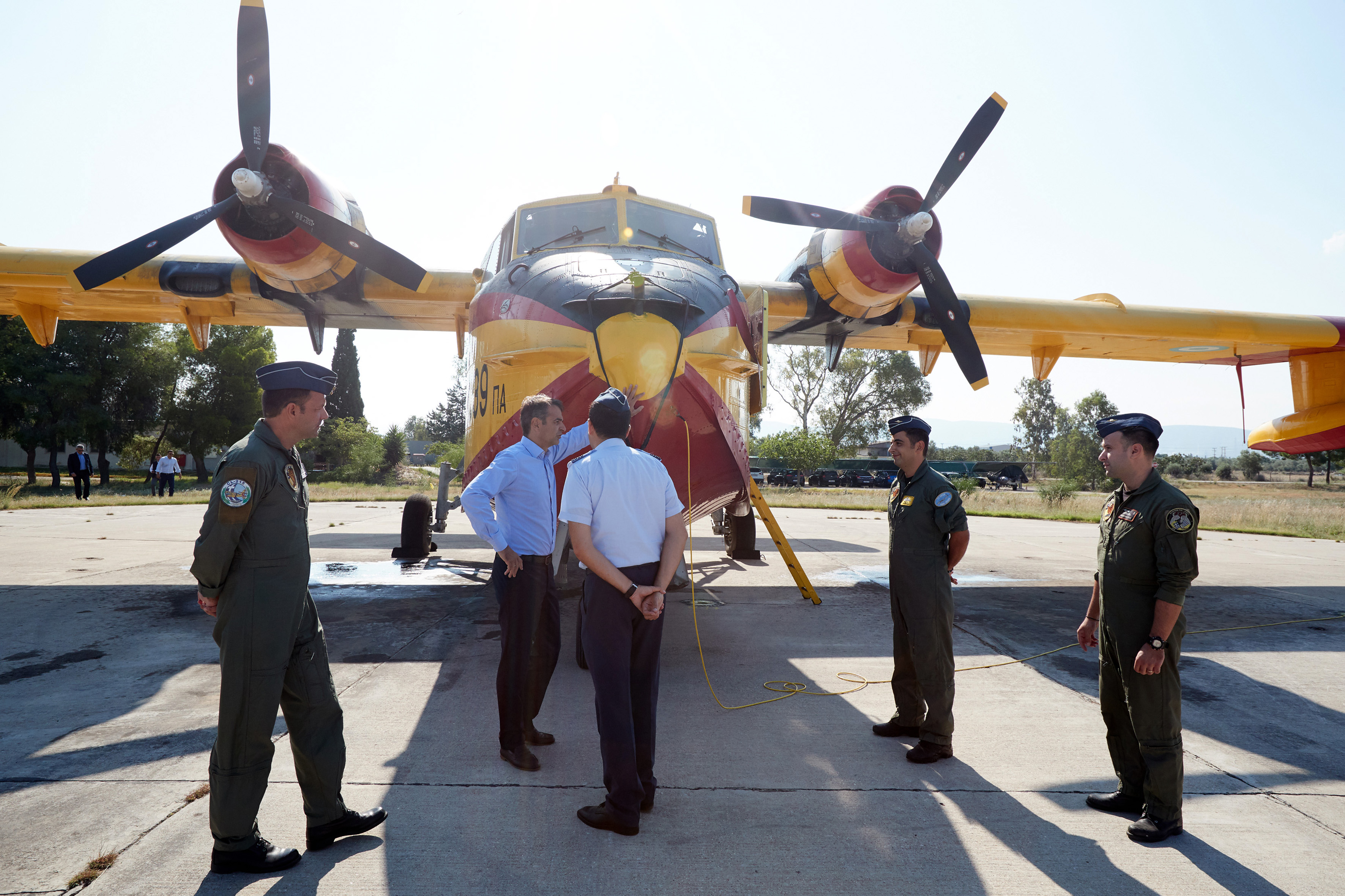 Ο κ. Μητσοτάκης συναντήθηκε με το διοικητή, Ταξίαρχο Κυριάκο Παναγιωτόπουλο, και στη συνέχεια επισκέφθηκε την 355 Μοίρα Τακτικών Μεταφορών, όπου και συναντήθηκε με τους πιλότους των πυροσβεστικών αεροσκαφών CL-415 και CL-215, οι οποίοι επιχειρούσαν στις πρόσφατες πυρκαγιές στην Κινέτα και την Πεντέλη.